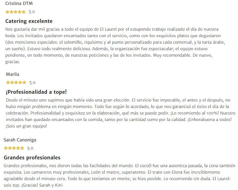 Este catering está especializado en banquetes tipos cóctel y se encargará de tener bajo control el más mínimo detalle para que todo sea perfecto. Su precio por cubierto va desde los 123€ en adelante. Aquí os dejo algunas opiniones: