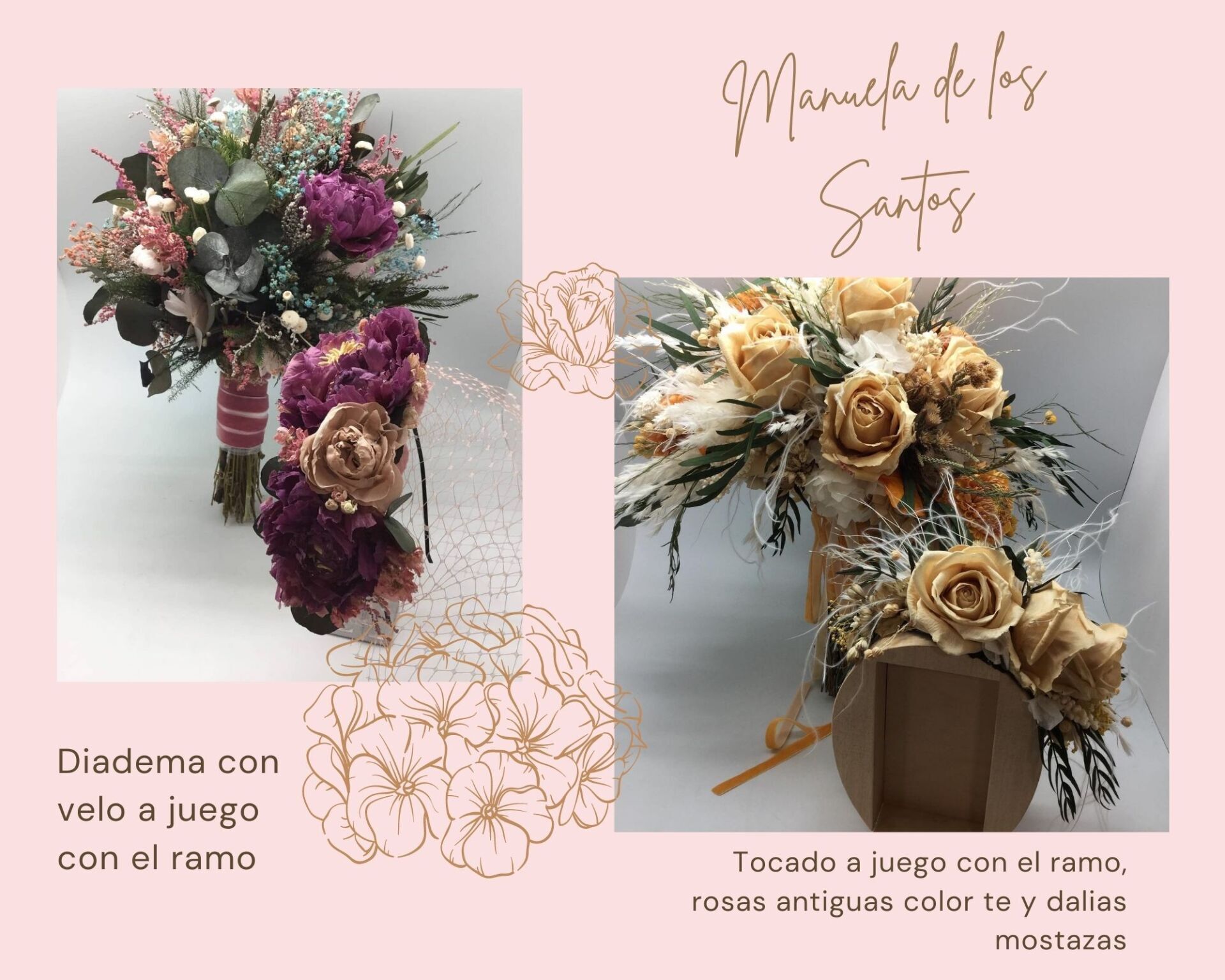 Pero no sólo se encargan de realizar tocados, realizan cualquier complemento de Novia o invitada desee; pulseras, collares, broches, prendidos, brazaletes, portalianzas, customización de zapatos, bolsos, pajaritas ... y por supuesto, ramos de flores liofilizadas o frescas y sus réplicas correspondientes. Hasta decoración floral para el hogar o los eventos. Es la ventaja de trabajar de forma artesanal y desde cero. Y Manuela se atreve con todos los pedidos que le llegan.
