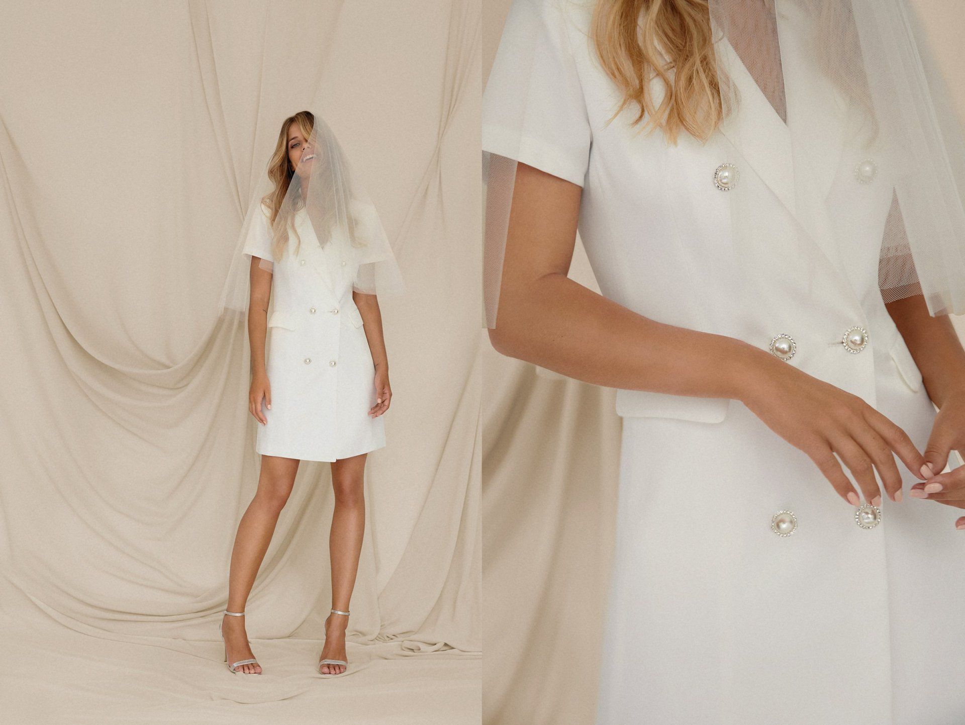 Mini vestido de novia de manga cortita realizado en crepe con textura tipo otoman. Estilo blazer cruzado con botones joya con perlas y cristalitos. Se pone y se abrocha como una chaqueta. Totalmente forrado.