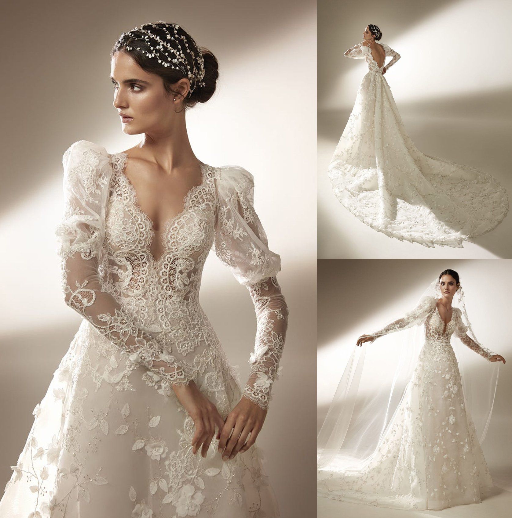 Este vestido de novia, confeccionado en encaje y adornado con sutil pedrería, deprende un aire de boda regia. Las mangas abullonadas y el cuerpo ceñido acentúan el fino talle mientras que la falda de corte en A acaba en una imperiosa cola real.